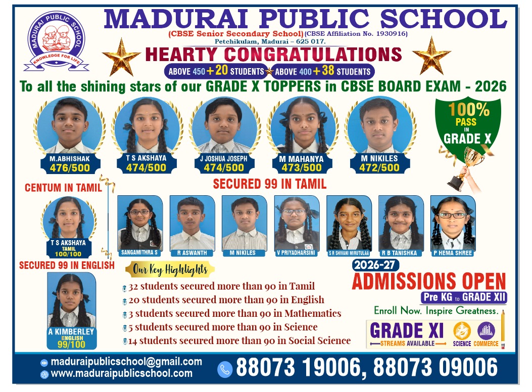 At Madurai Public School we embrace a child-centered philosophy that promotes creative thinking and lifelong learning. Our educators are dedicated to inspiring children to achieve the very highest standards in all their endeavors as they progress their educational journey with us. Through partnerships with parents, we strive to make every academic dream a reality.